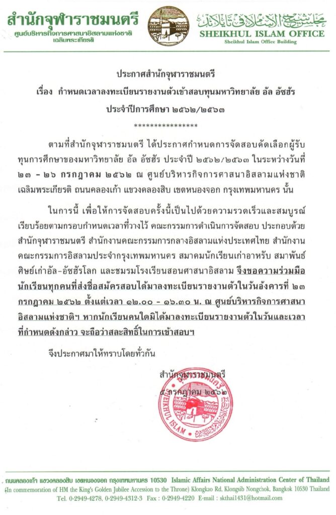 ประกาศสำนักจุฬาฯ เรื่อง รายงานตัวเข้าสอบทุน ม.อัซฮัร