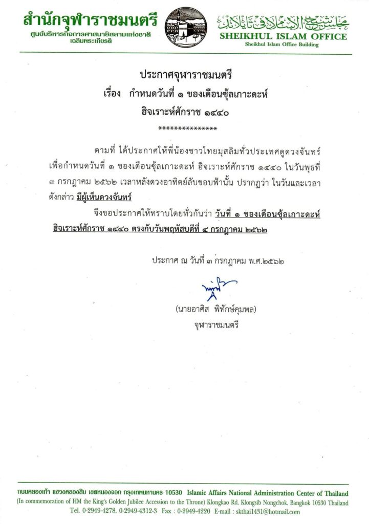ประกาศสำนักจุฬาฯ เรื่อง กำหนดวันที่ 1 เดือนซุลเกาะดะห์ ฮ.ศ.1440